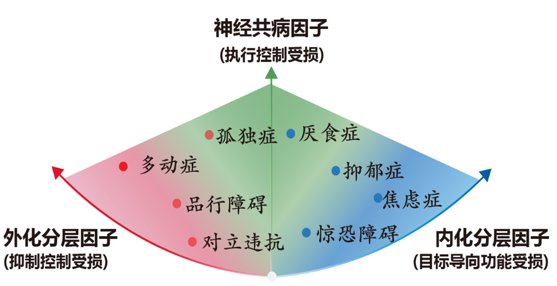 依托从青春期至青年期的大型纵向神经影像学队列(IMAGEN),研究团队识别出多种精神疾病共有的脑网络特征,并经由遗传学及临床数据双重验证,提出了“前额叶发育障碍导致执行功能受损”的共病理论(Xie et al., Nat Med 2023)。此外,为进一步阐明不同层级共病现象间的内在关联,团队深入解析了“神经共病因子”对内化及外化疾病脑网络的调控机制,首次提出了关于“精神疾病分层共病现象”的认知神经调控模型。